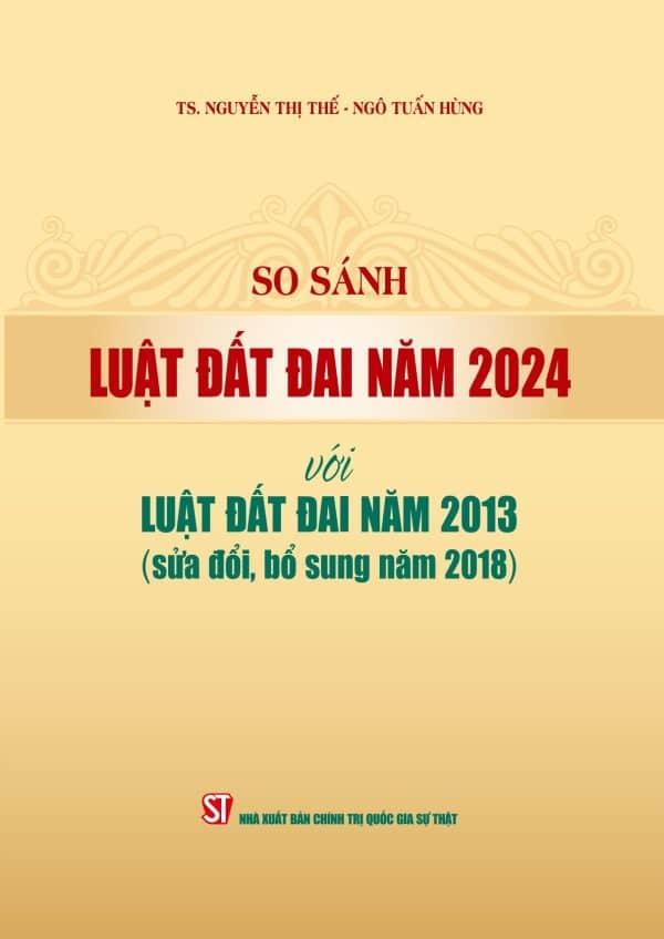 Cuốn sách So sánh Luật Đất đai năm 2024 với Luật Đất đai năm 2013 (sửa đổi, bổ sung năm 2018), qua đó giúp cán bộ, công chức và người dân tìm hiểu, nghiên cứu quy định của Luật Đất đai năm 2024, nhận diện nhanh, chính xác những nội dung mới, nội dung được sửa đổi của Luật, góp phần nâng cao chất lượng thi hành luật, phục vụ tốt nhu cầu công việc của doanh nghiệp và người dân liên quan đến phạm vi điều chỉnh của Luật. Cuốn sách còn là tài liệu tham khảo hữu ích cho sinh viên, học viên ngành luật.